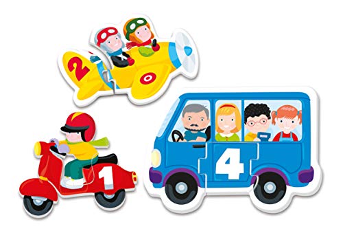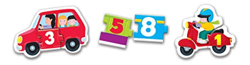 Con tante tessere a incastro per associare numeri e quantità con l’aiuto di simpatiche immagini dei mezzi di trasporto