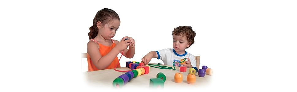 Trenta perline di legno in sei brillanti colori e cinque forme distinte si combinano con due stringhe extra lunghe per molte attività. Infilare le perline facili da afferrare promuove il coordinamento oculo-manuale, le abilità motorie fini e cognitive e la percezione visiva.